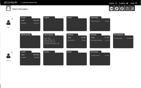 Cam has $750,000 in a qualified account and Carmen has $150,000 in a separate qualified account. Cam has $2,500 in a Social Security benefit amount and Carmen has $1,500. Income InSight also includes joint folders and options to enter insurance and other income.