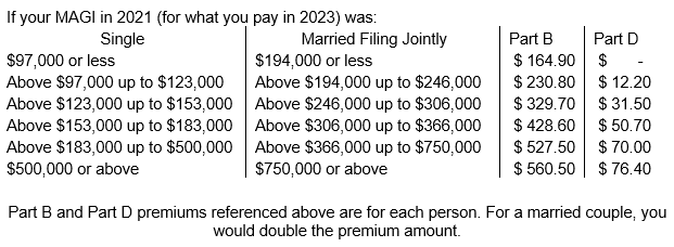 For instance, if your client's MAGI in 2022 was greater than $103,000 for a single or $206,000 for a couple married filing jointly, then they will pay a surcharge in addition to their normal premiums.