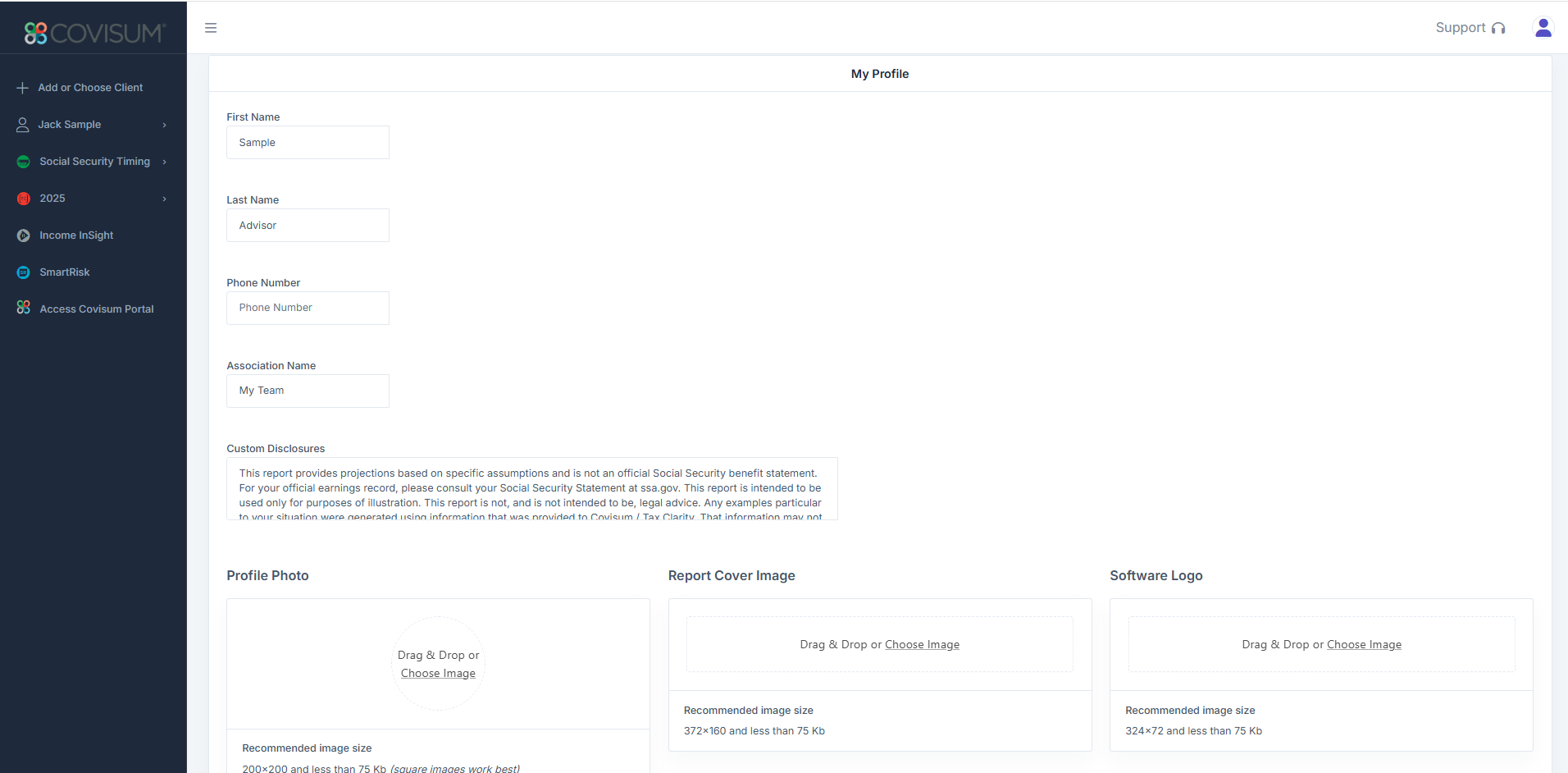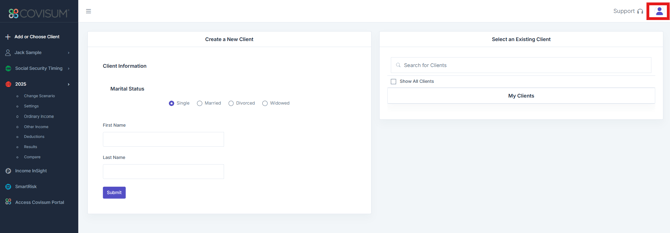 Login to your account at https://suite.covisum.com and click on the user icon in the upper right corner