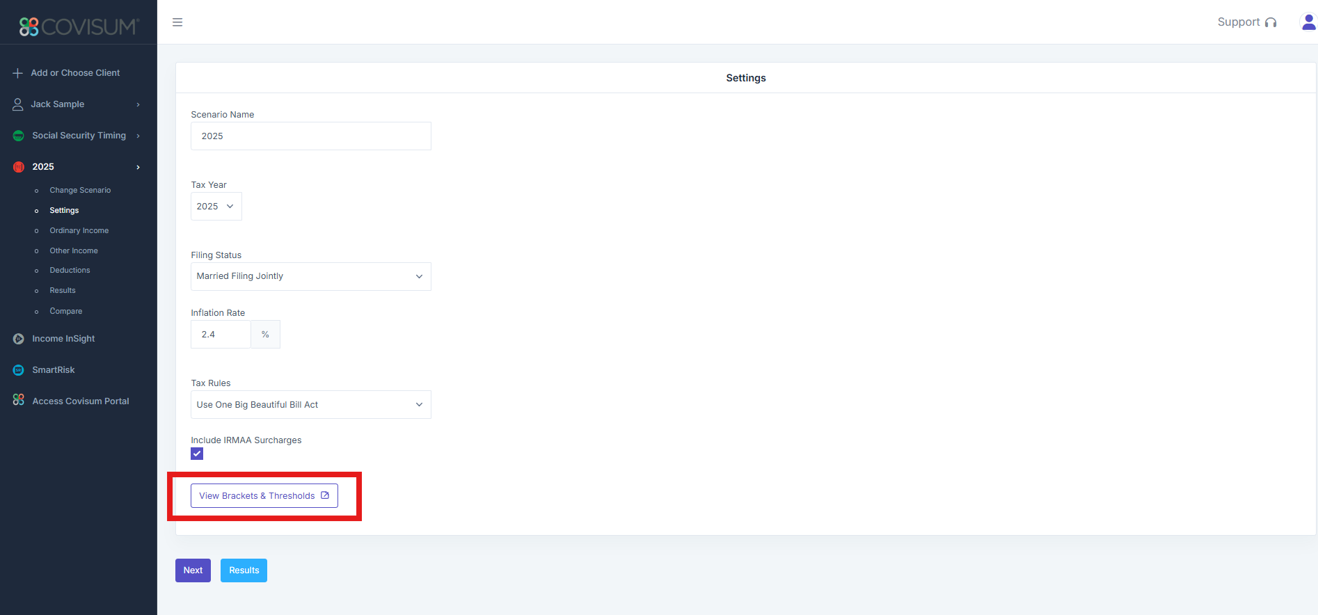 You can find the table listed above in Tax Clarity by clicking "Brackets & Thresholds" in the "Settings" section of the "Input Data" tab. In addition, you can see the bracket and threshold differences between ordinary income and capital gains, along with tables for exemptions and the possible Medicare impact.