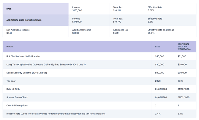 | Total Tax Burden on $1000 IRA withdrawal | $559.44 |